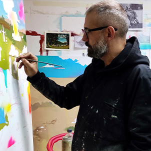 Alejandro Pastor, también conocido como Alexander Grahovsky, es un pintor figurativo y surrealista español que explora la frontera entre realidad y fantasía. Su trabajo combina trazos ingenuos con detalles meticulosos para crear paisajes y narrativas poéticas y lúdicas donde el inconsciente y la imaginación juegan un papel central.
